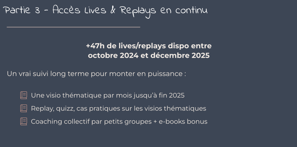 2 lives/mois en petit groupe pendant 3 mois avec Océane : sur des thématiques, des Q&A, des mises en pratique